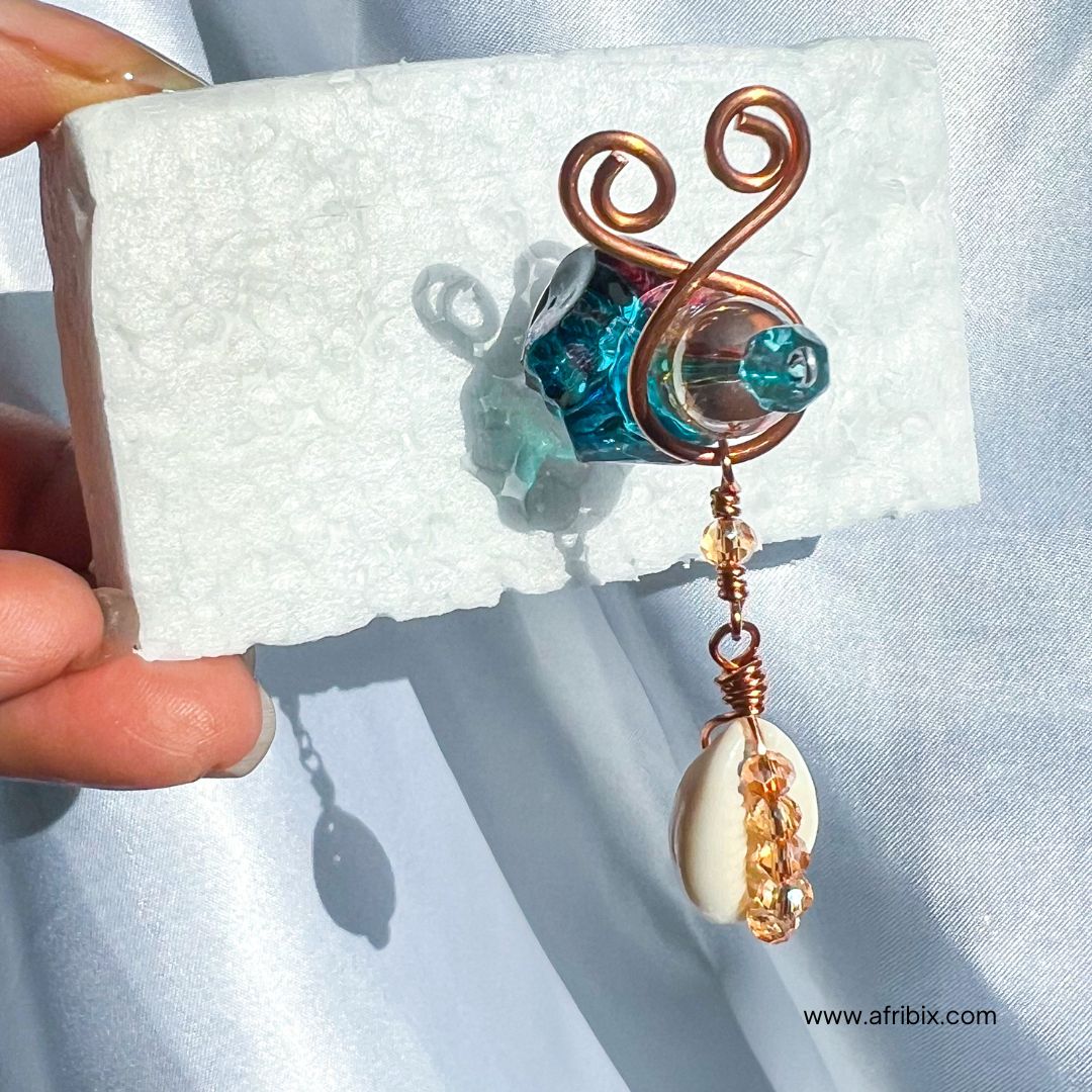 Embellished with cowrie and crystal beads.