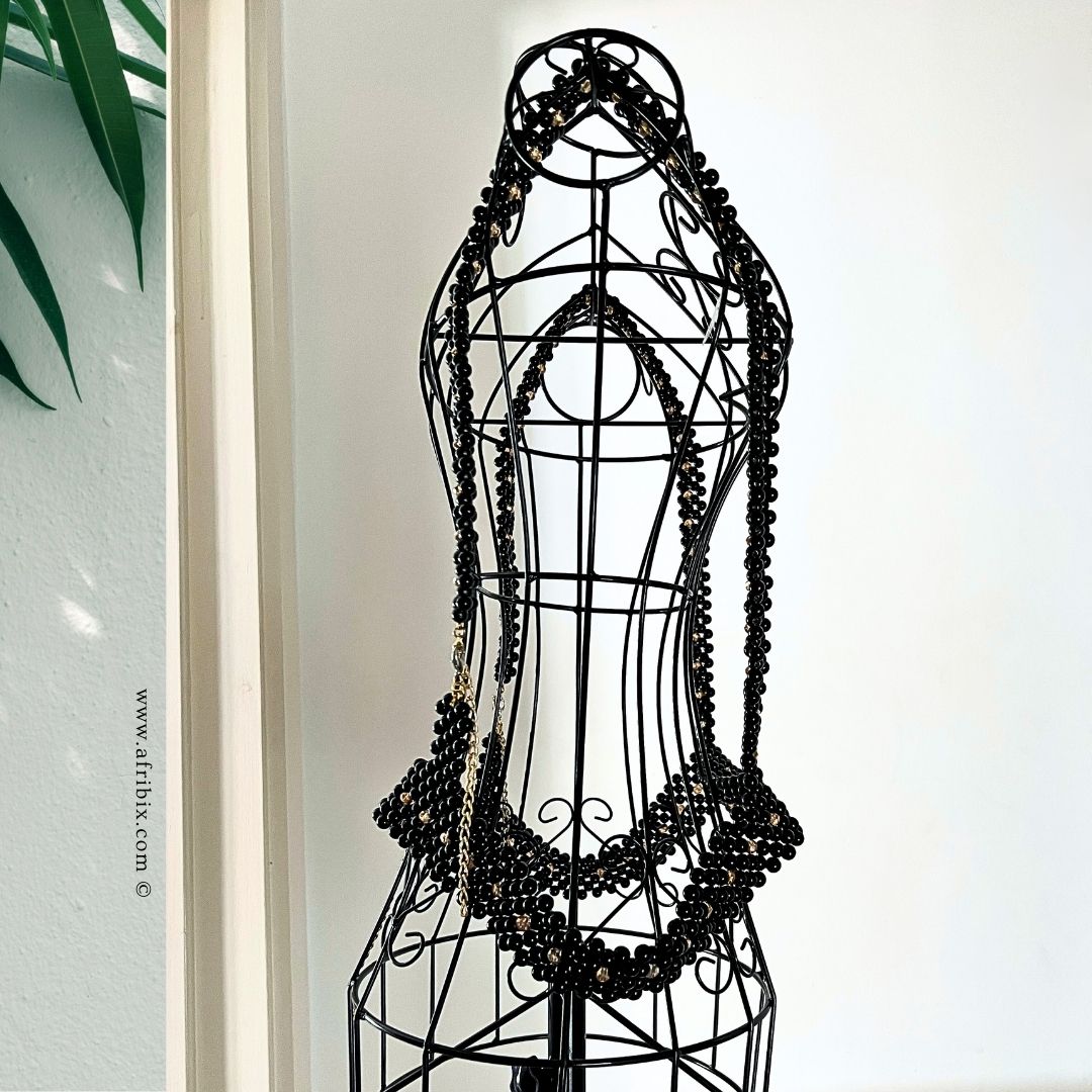 Transform your look with this black bead body harness. With its captivating silhouette, Ella is the ideal accessory for sophisticated ensembles like a dress, bikini, or evening gown.
