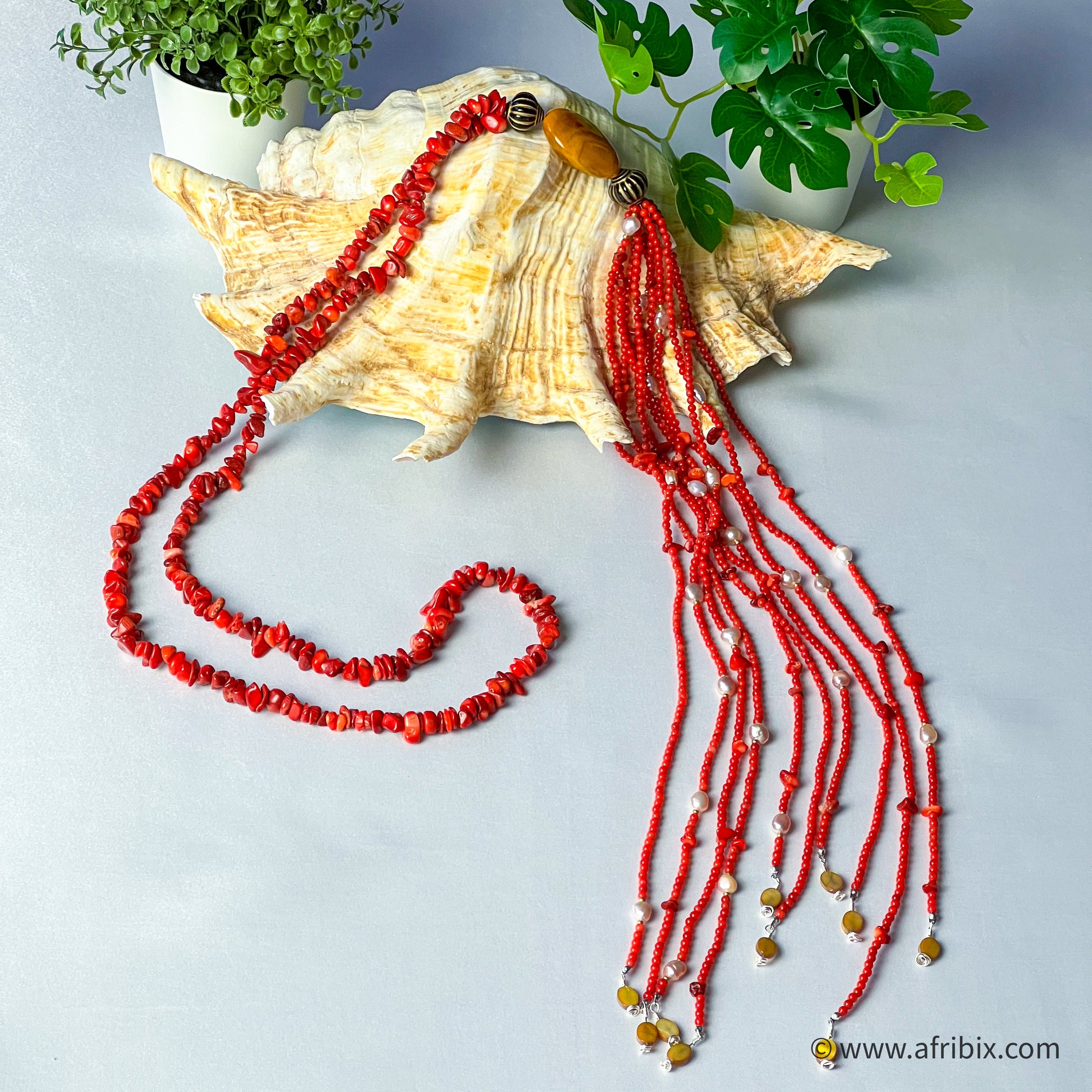 This genuine coral necklace is the crown jewel of Our Emotan Collection. Made with genuine sustainably sourced corals and embellished with pearls, this necklace is eye-catching, precious and exquisite.