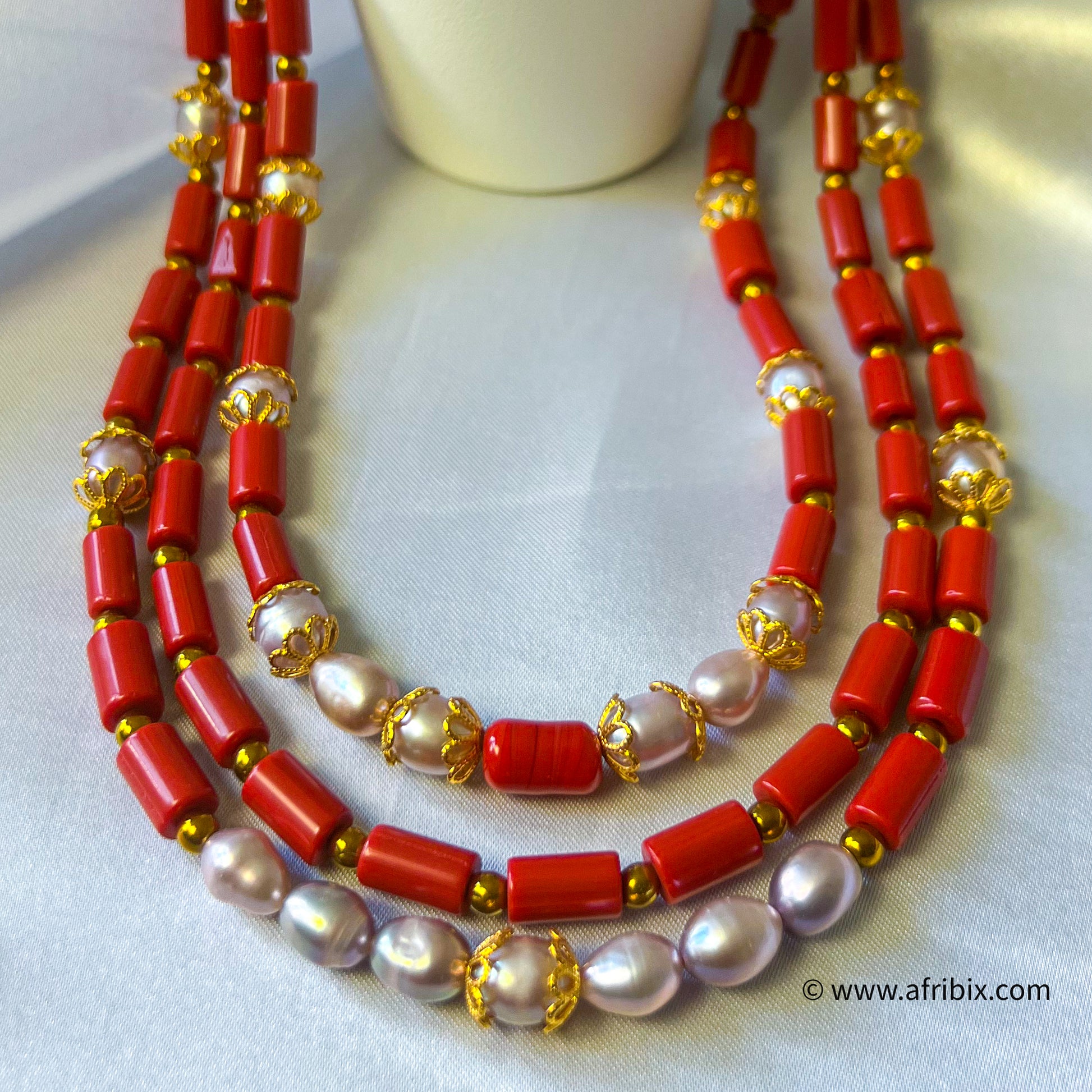 This 3-piece coral necklace is the ultimate statement piece. Made with genuine sustainably sourced freshwater pearls and corals, this necklace is eye-catching, precious and exquisite.