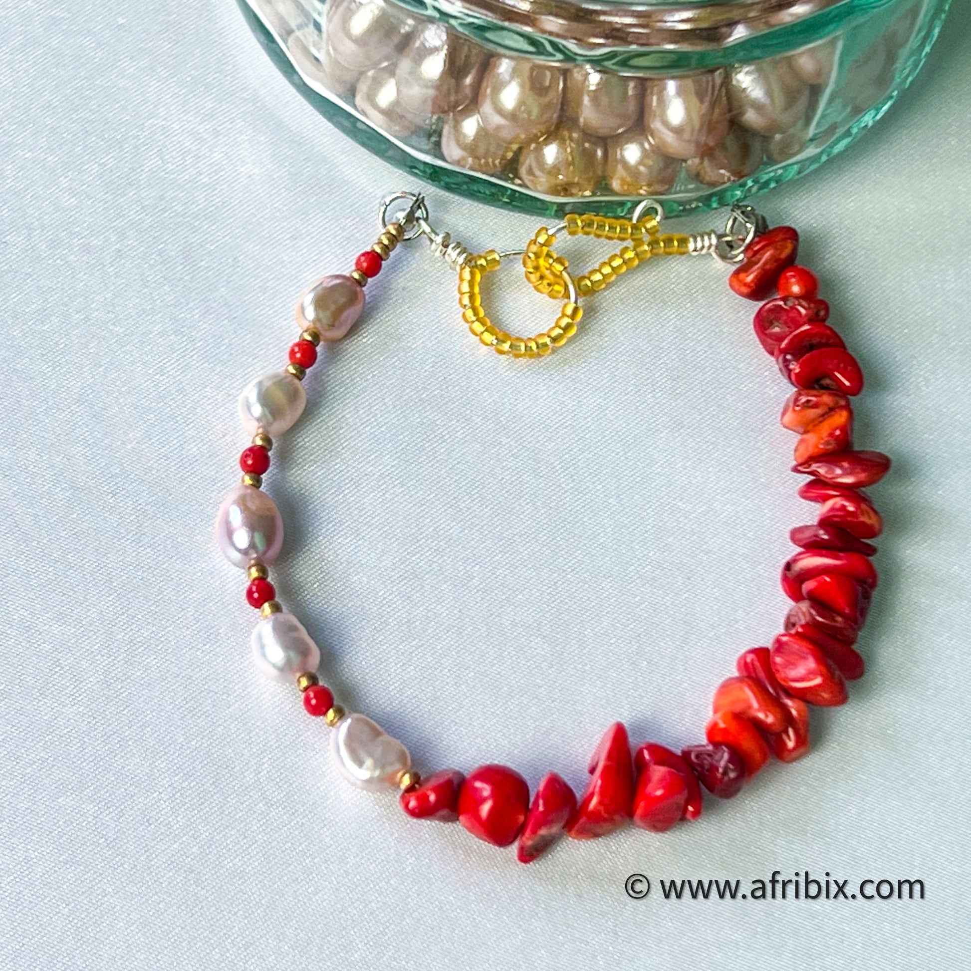 Adorn your wrist with this delicate genuine coral and freshwater pearl bracelet, lovingly hand-crafted to achieve that flawless and timeless appeal elegant jewellery exudes.