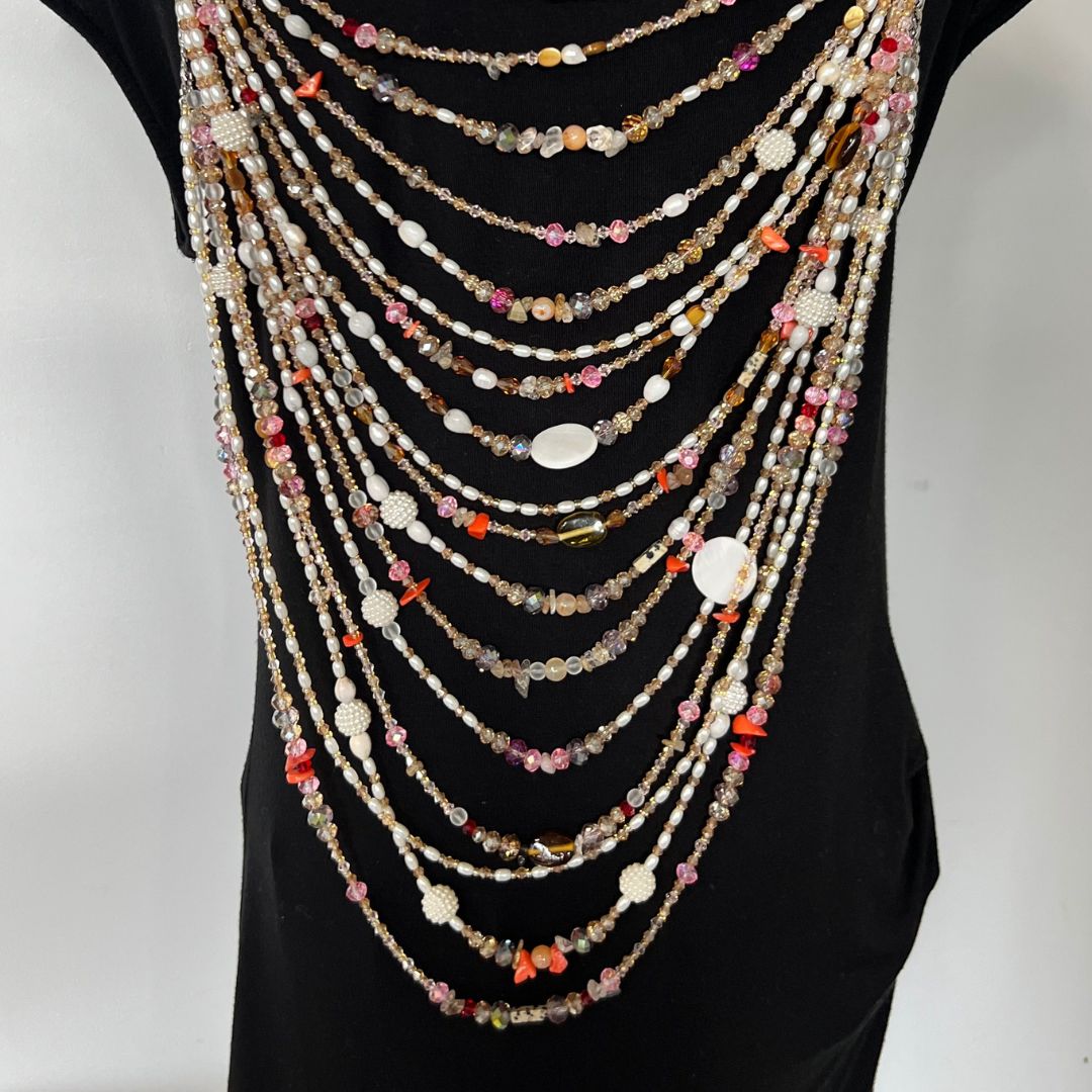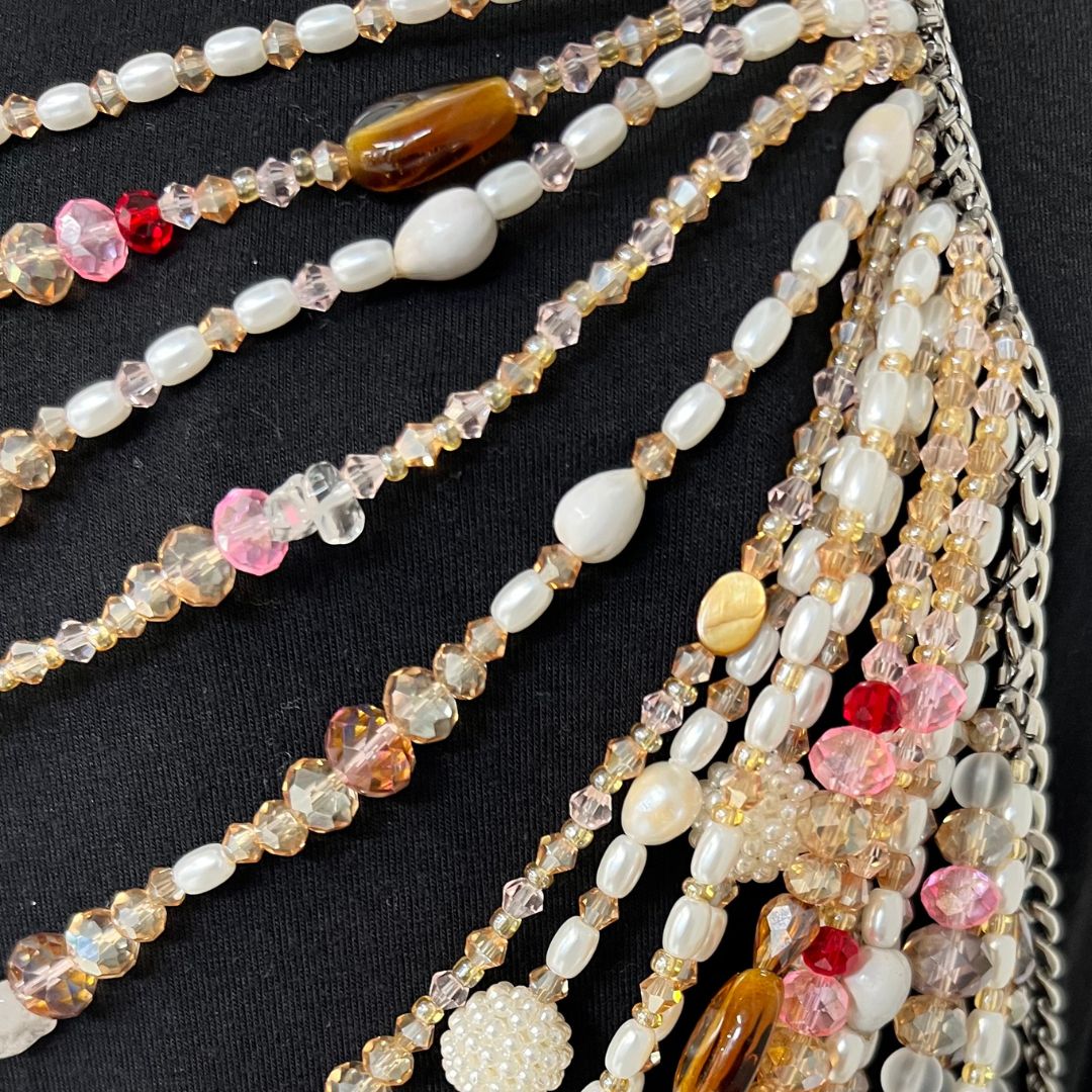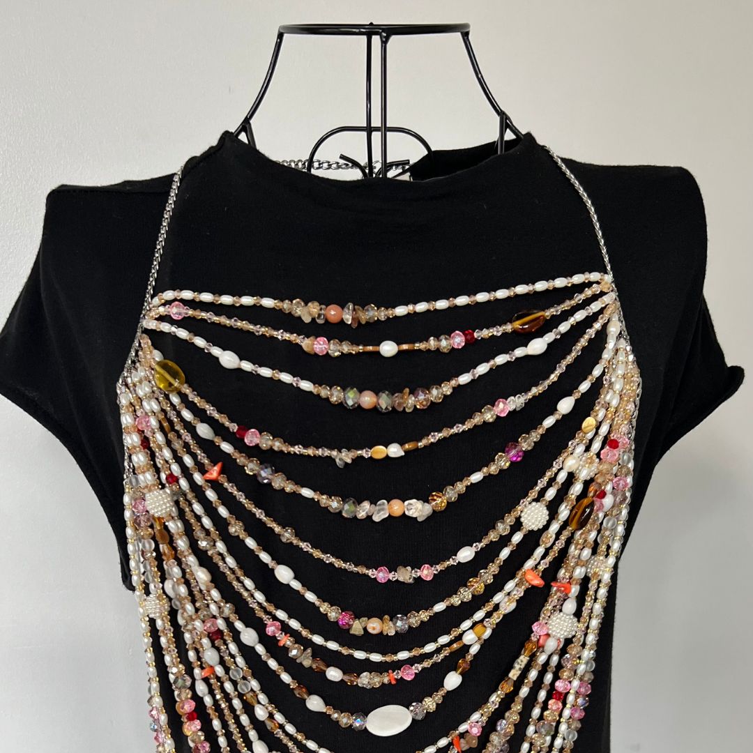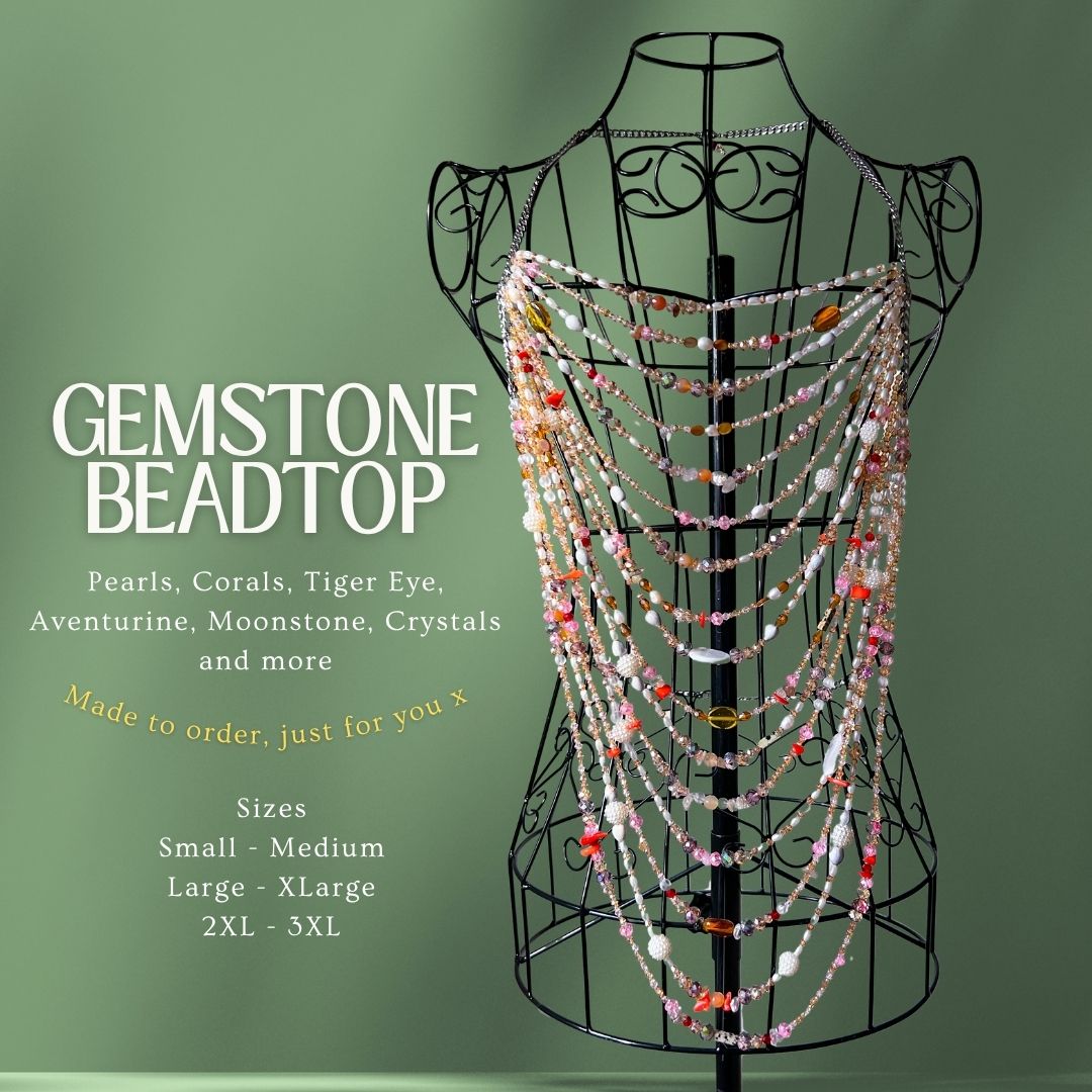 Transform your wardrobe with this sophisticated gemstone bead top that will elevate any outfit. Featuring a harmonious blend of pearls, tiger eye, crystals, and aventurine. Crafted on a tarnish-proof stainless steel silver chain, it offers lasting elegance and style.