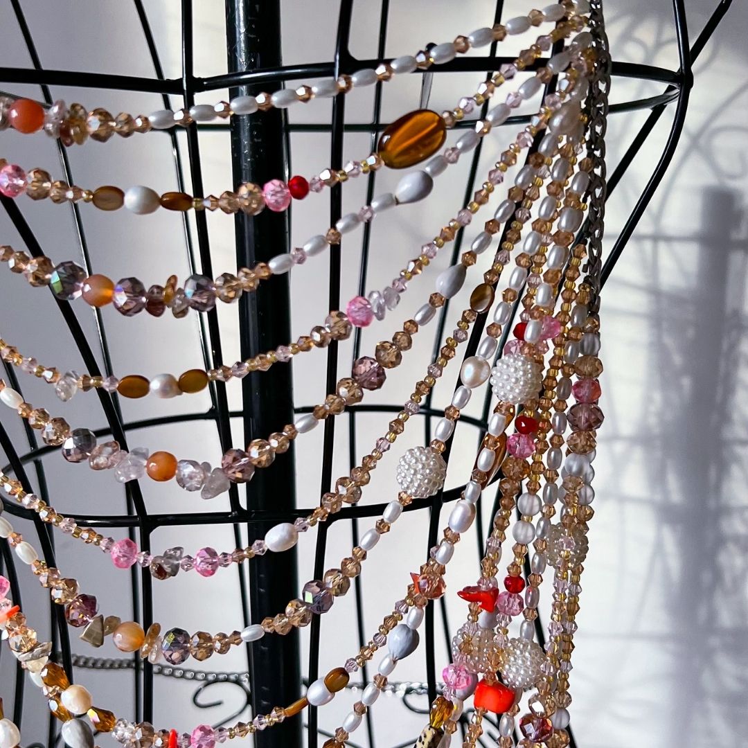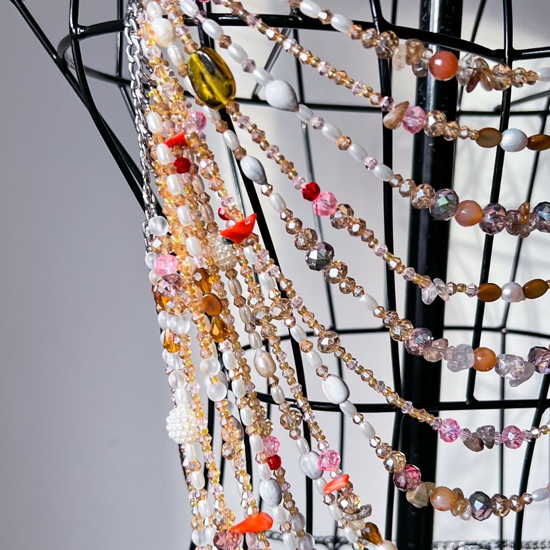 - Features a blend of pearls, tiger eye, crystals, and aventurine gemstones