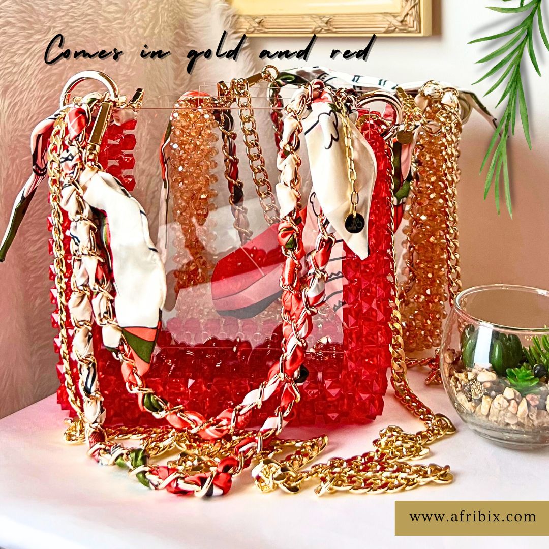 This dazzling champagne gold crystal see through handbag is a beauty to behold. Handcrafted to perfection, this bead bag is elegant.