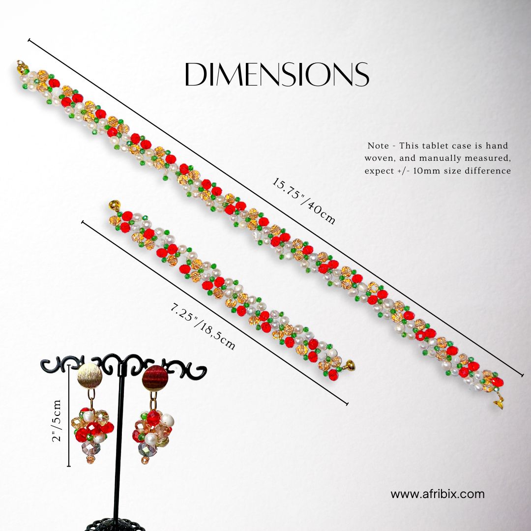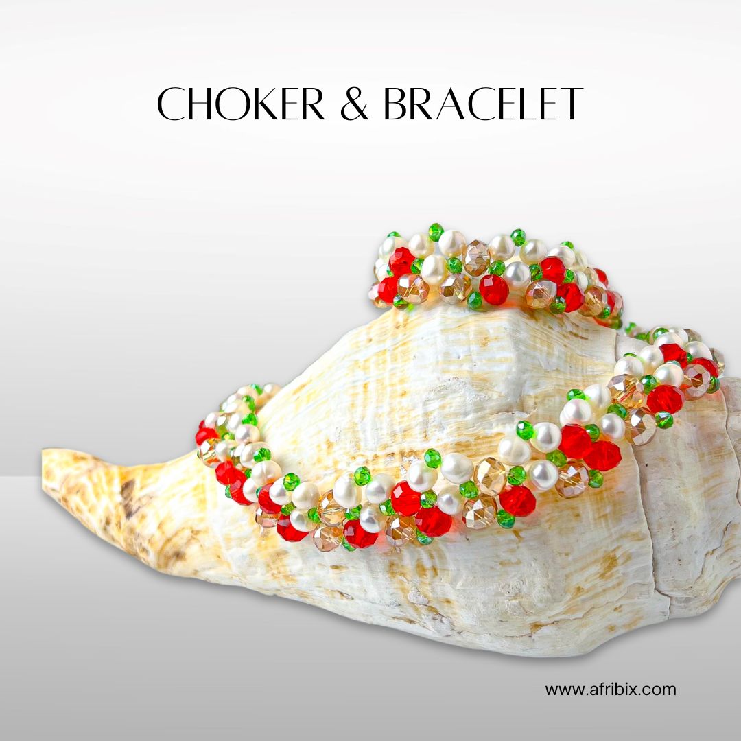 Expertly crafted with timeless pearls and sparkling crystals, this 3-piece choker necklace set adds the perfect touch of elegance to any outfit. With gold, green, and red accents, this versatile pearl and crystal necklace, bracelet and earrings set oozes sophistication.