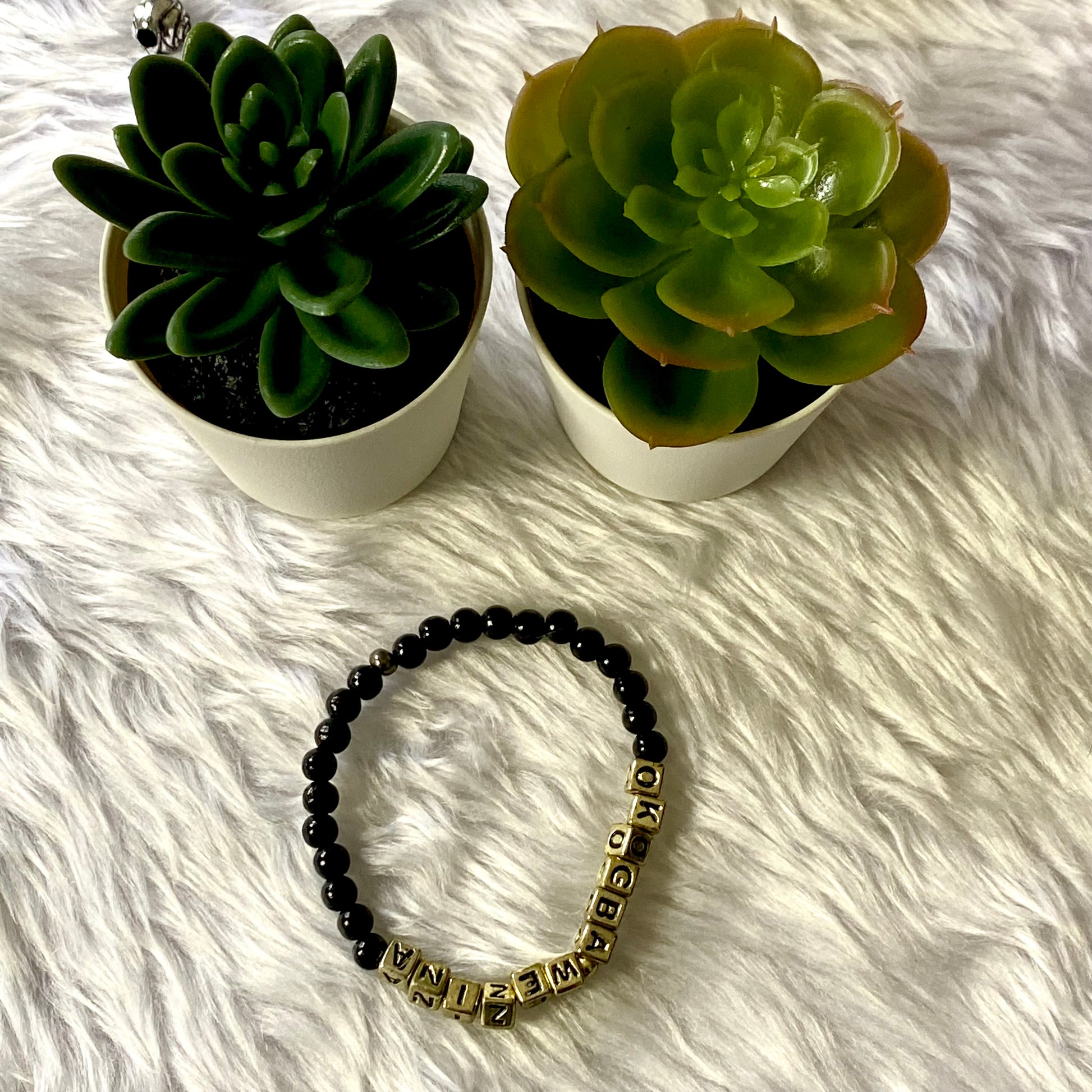 Black wooden craft beads. Gold acrylic beads with black lettering. Transparent Elastic Thread. Colour and shape of beads may vary. Not every bracelet is the same, hence why each piece is unique. Each bead is made to order. Personalisations are available, email support@afribix.com to find out more.