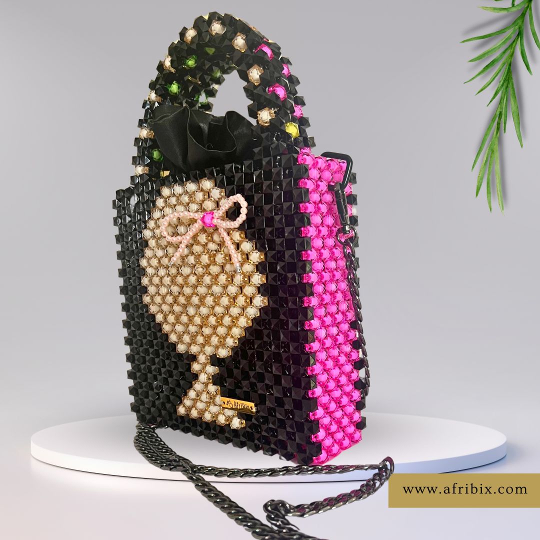 Pink and Black Afro Emoji Girly Statement Bead Hand Bag