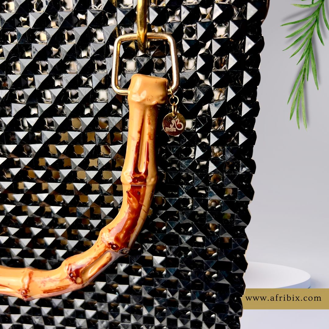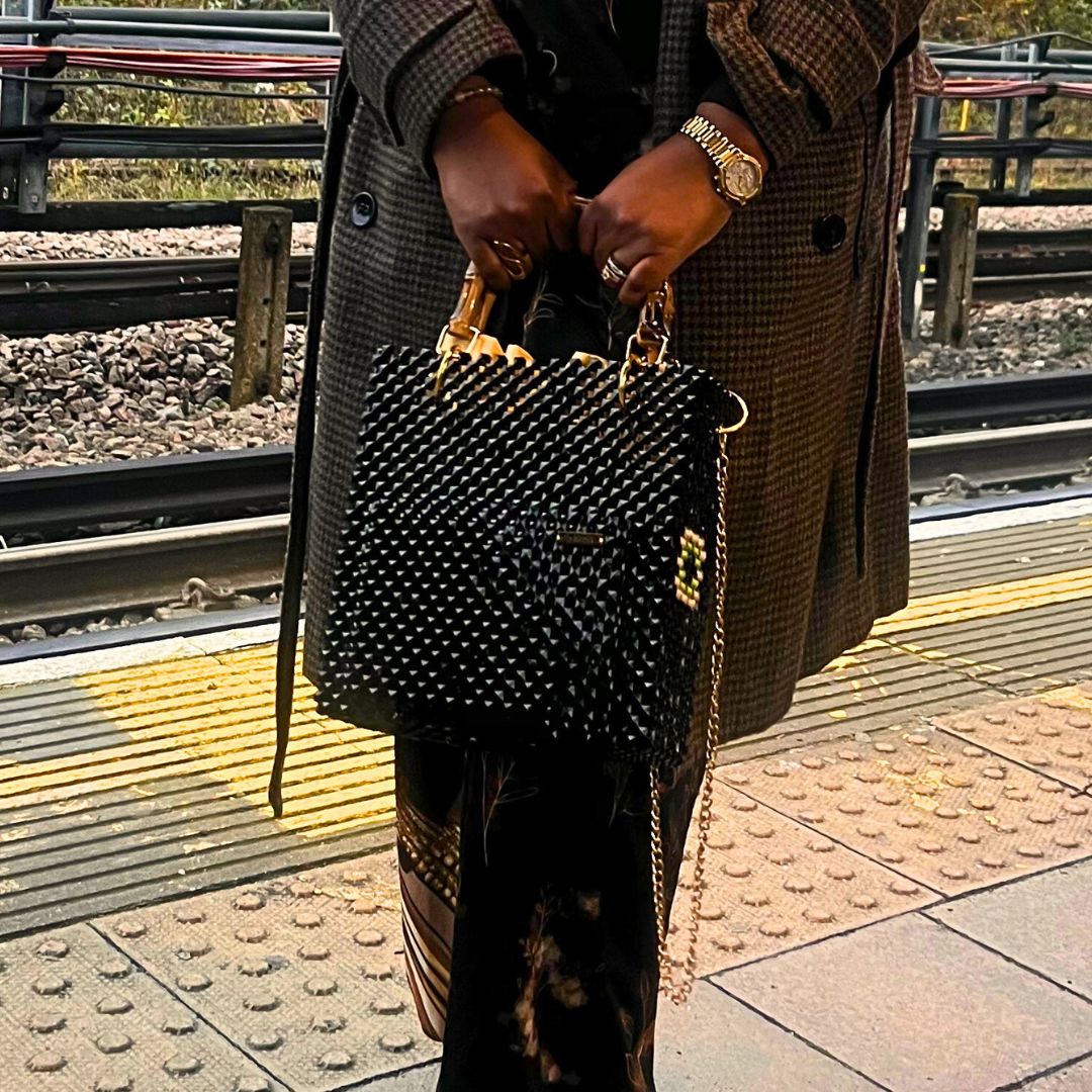 A fresh twist on the traditional tote, channel your inner Boss with this sophisticated large bead handbag that's perfect for work and comes with a card holder for your bank and business cards. Handcrafted from premium black beads, and finished with gold fastenings, this structured statement handbag is versatile, durable and elegant.