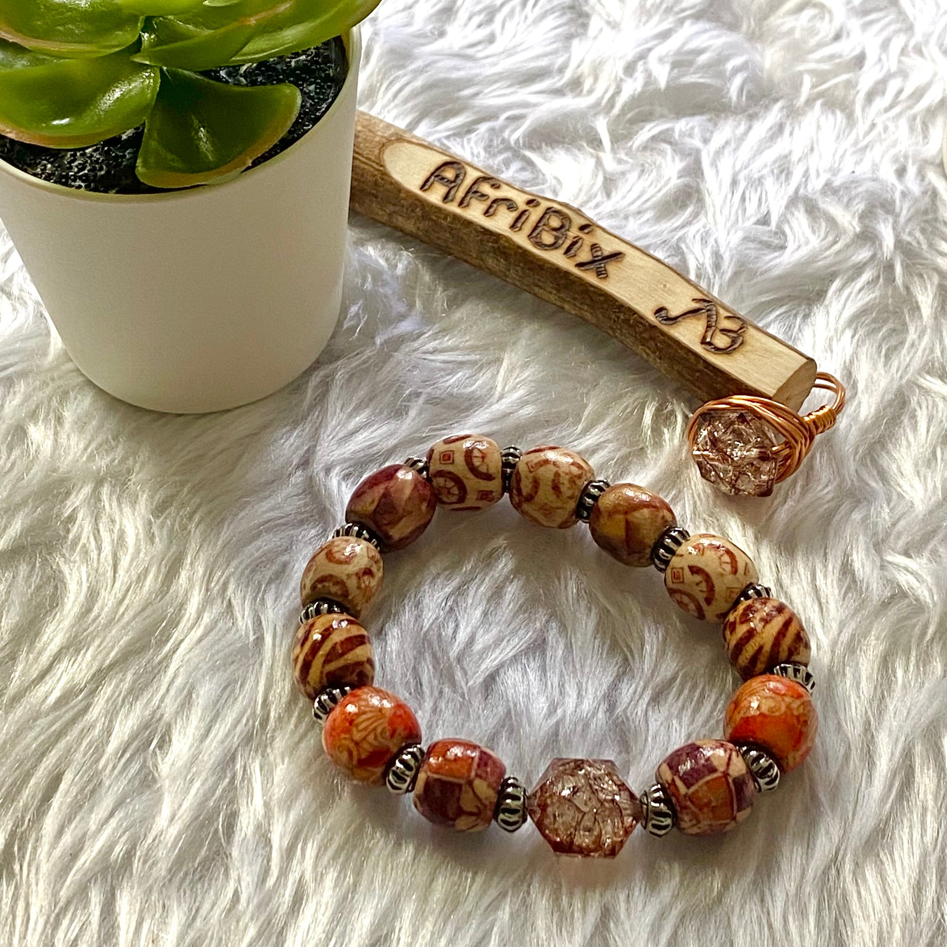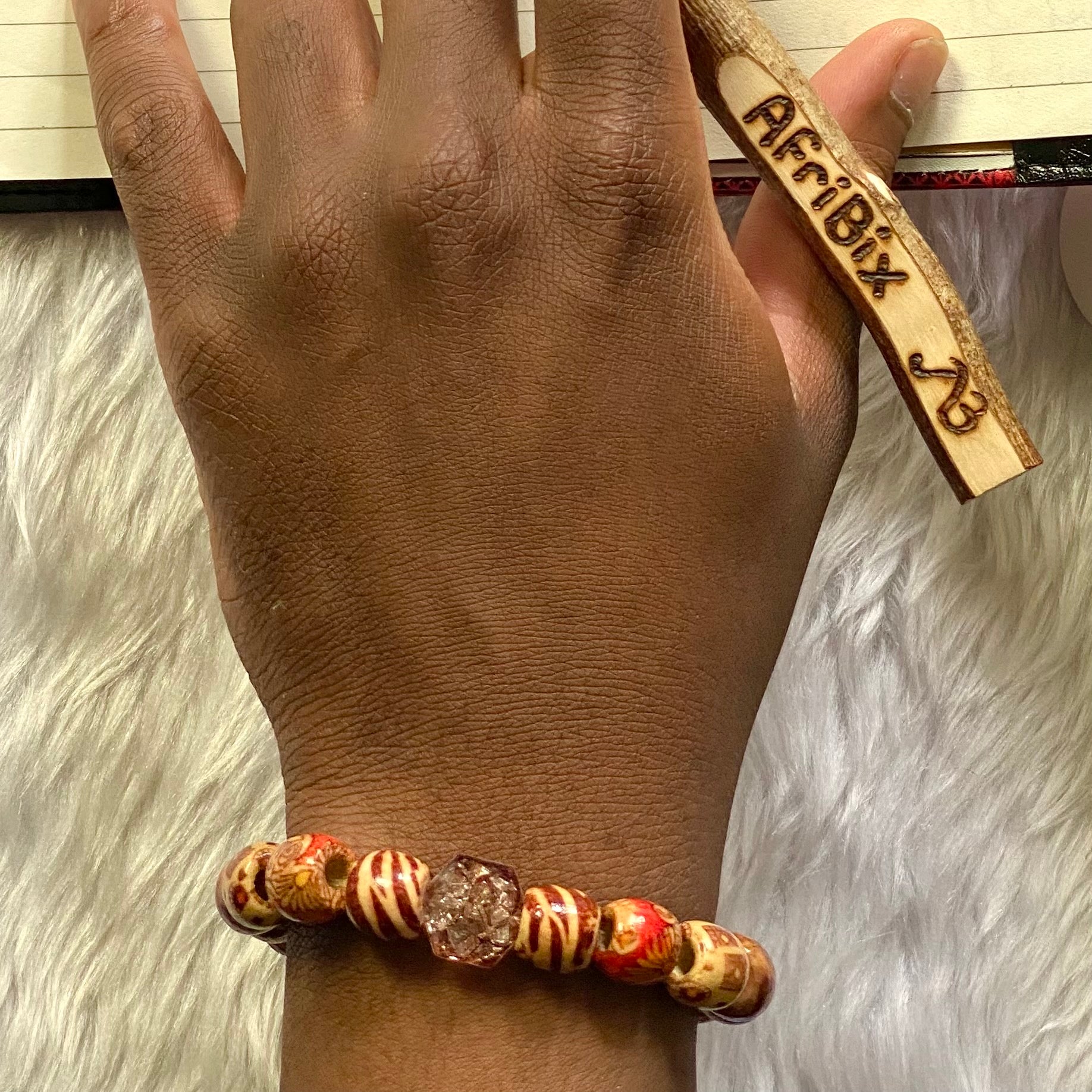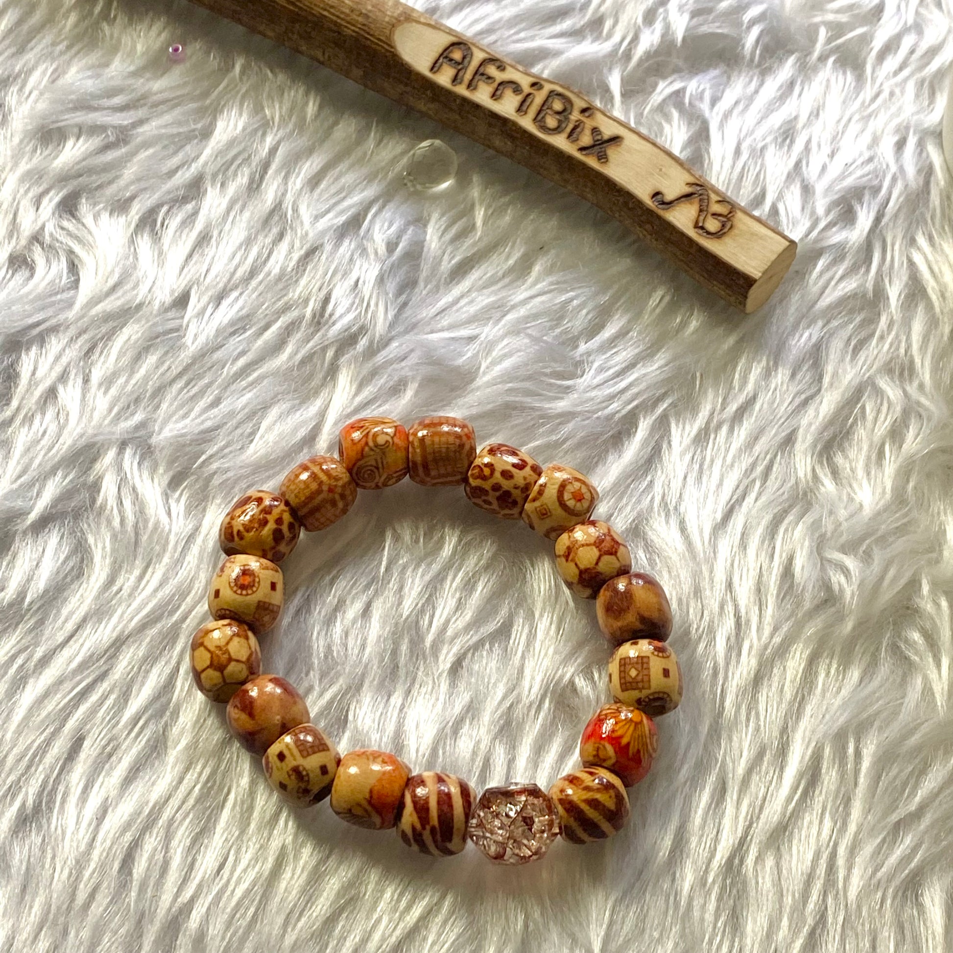 Natural wood, non-toxic and lead free wooden beads and transparent elastic thread. Colour and pattern of beads may vary. Not every bracelet is the same, hence why each piece is unique. Each bead is made to order. Email support@afribix.com to find out more.